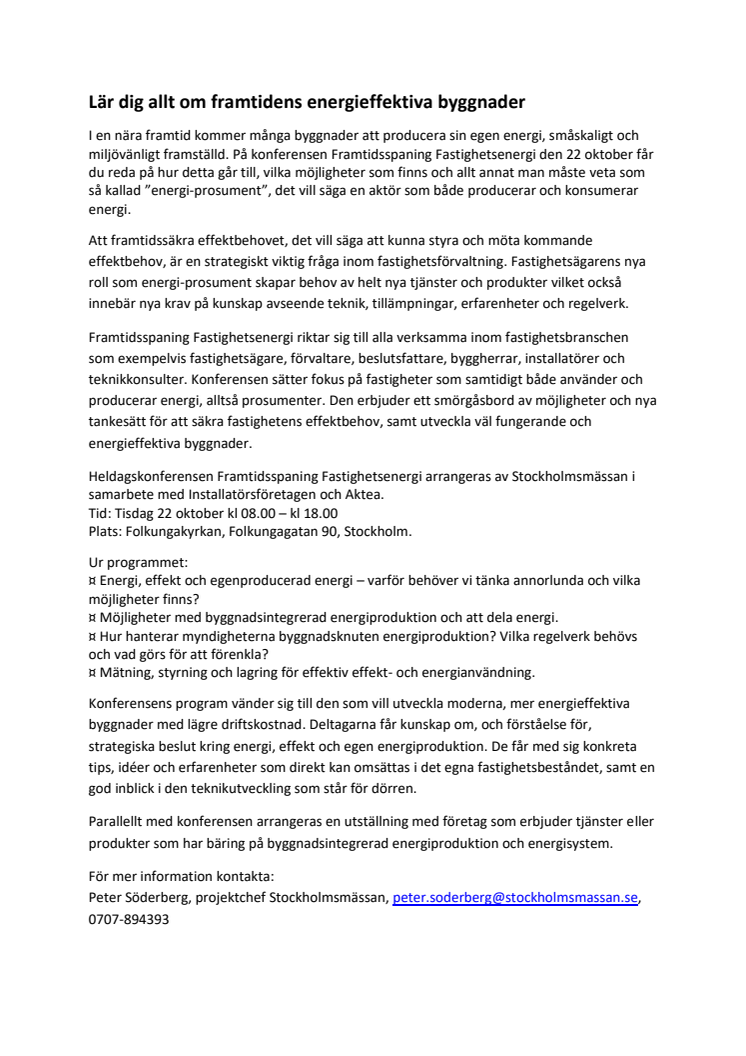 Peter Söderberg, projektchef Stockholmsmässan, peter.soderberg@stockholmsmassan.se, 0707-894393