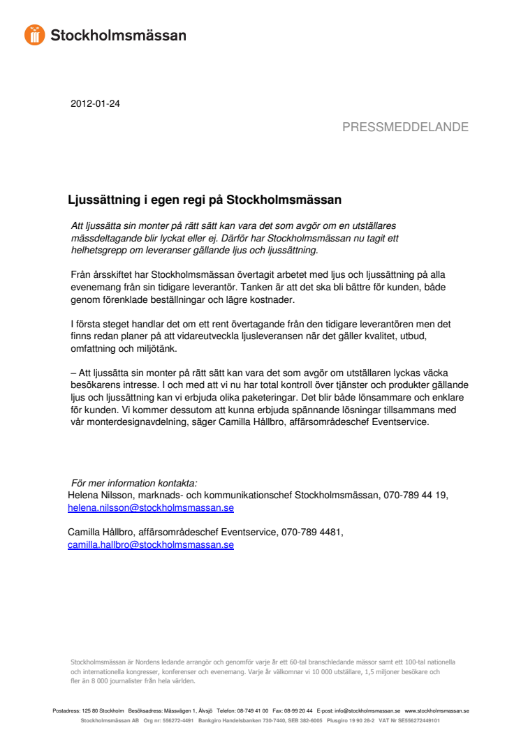 Camilla Hållbro, affärsområdeschef Eventservice, 070-789 4481, camilla.hallbro@stockholmsmassan.se