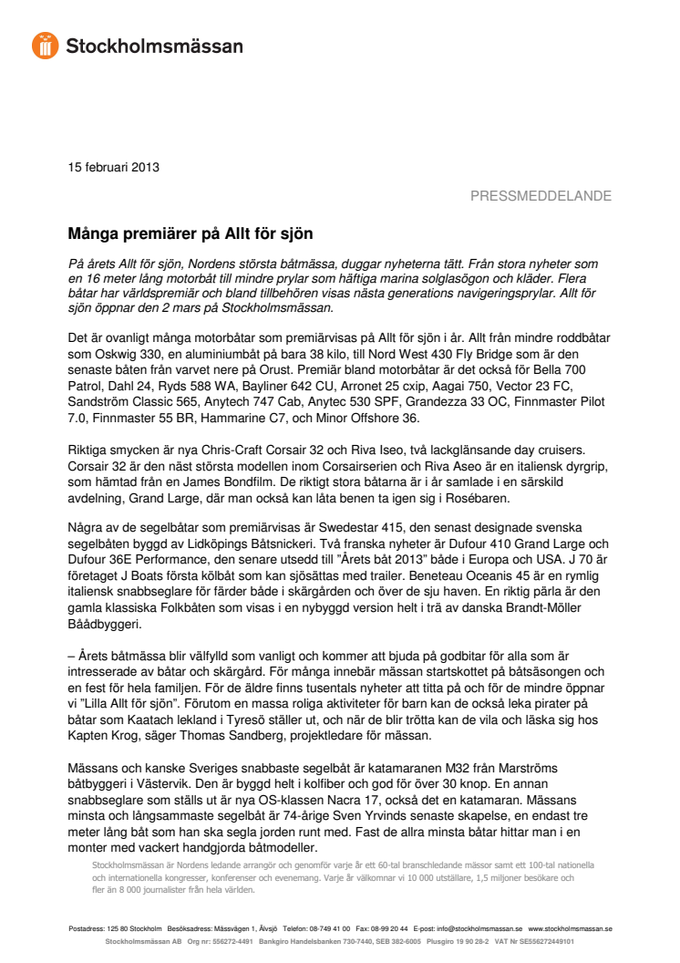 Allt för sjön 2-10 mars är Skandinaviens största båtmässa och ett av Sveriges största, årliga inomhusevenemang som hålls på Stockholmsmässan. Se mer på alltforsjon.se. För mer information kontakta: