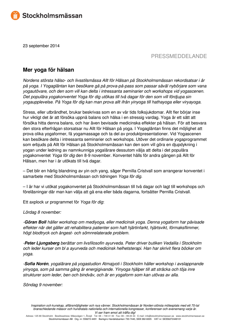 Nordens största hälso- och livsstilsmässa Allt för Hälsan på Stockholmsmässan rekordsatsar i år på yoga. I Yogagläntan kan besökare gå på prova-på-pass som passar såväl nybörjare som vana yogautövare, och den som vill kan delta i intressanta seminarier och workshops vid yogascenen. Det populära yogakonventet Yoga för dig utökas till två dagar för den som vill fördjupa sin yogaupplevelse. På Yoga för dig kan man prova allt ifrån yinyoga till hathayoga eller viryayoga.