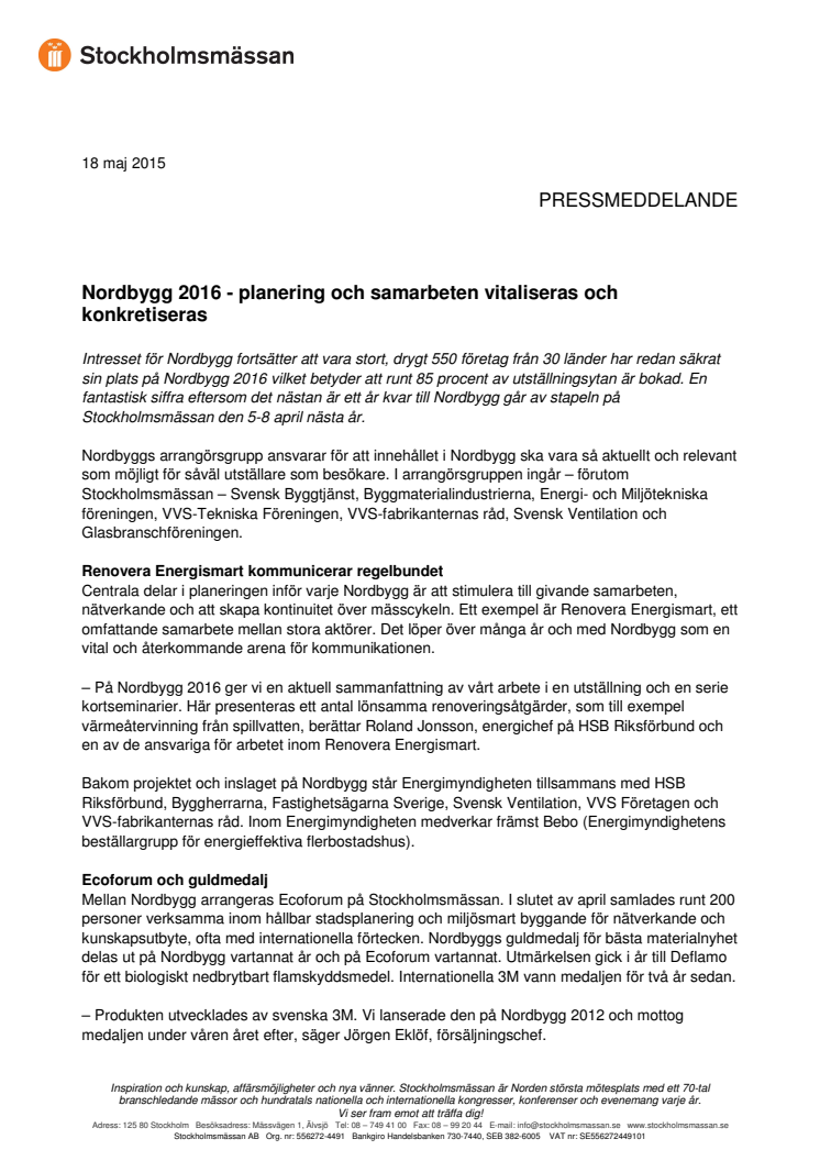 Nordbygg är samhällsbyggnadssektorns viktigaste mötesplats. Med 800 utställare från drygt 30 länder tar mässan ett helhetsgrepp om utvecklingen i bygg-, VVS- och fastighetsbranscherna. Mässan går av stapeln den 5-8 april 2016 på Stockholmsmässan i Älvsjö
