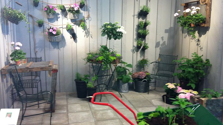 Minna skapade en härlig täppa med många smarta detaljer. Framförallt lyckades hon bygga på höjden med hjälp av krukor som hängdes i ståltrådar, en tom löklåda, korgar och rep som spikades fast.
