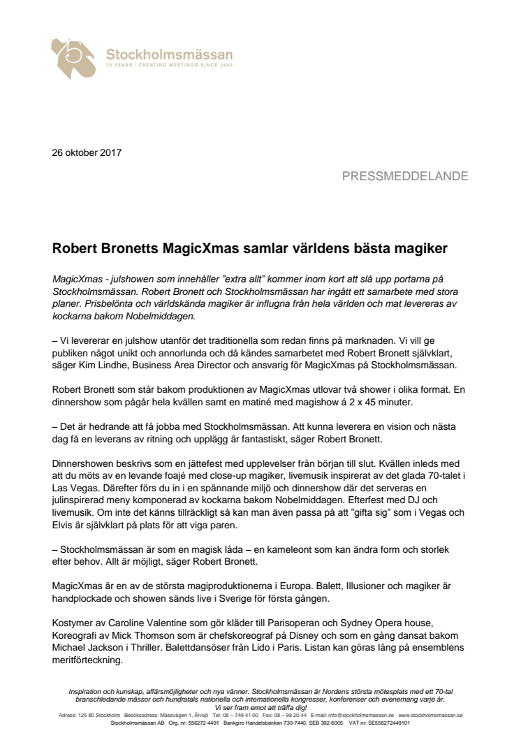 MagicXmas - julshowen som innehåller ”extra allt” kommer inom kort att slå upp portarna på Stockholmsmässan. Robert Bronett och Stockholmsmässan har ingått ett samarbete med stora planer. Prisbelönta och världskända magiker är influgna från hela världen och mat levereras av kockarna bakom Nobelmiddagen.