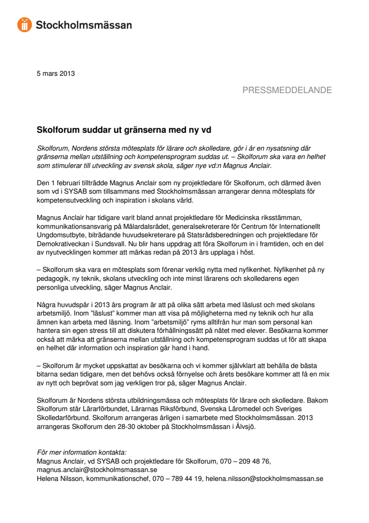 Den 1 februari tillträdde Magnus Anclair som ny projektledare för Skolforum, och därmed även som vd i SYSAB som tillsammans med Stockholmsmässan arrangerar denna mötesplats för kompetensutveckling och inspiration i skolans värld.