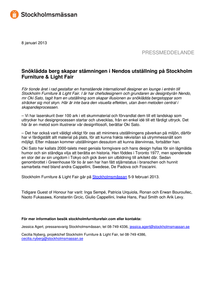 För tionde året i rad gestaltar en framstående internationell designer en lounge i entrén till Stockholm Furniture & Light Fair. I år har chefsdesignern och grundaren av designbyrån Nendo, mr Oki Sato, tagit fram en utställning som skapar illusionen av snöklädda bergstoppar som sträcker sig mot skyn. Här är inte bara den visuella effekten, utan även metoden central i skapandeprocessen.