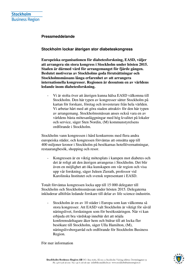Europeiska organisationen för diabetesforskning, EASD, väljer att arrangera sin stora kongress i Stockholm under hösten 2015. Staden är därmed värd för arrangemanget för fjärde gången. Beslutet motiveras av Stockholms goda förutsättningar och Stockholmsmässans långa erfarenhet av att arrangera internationella kongresser. Regionen är dessutom en av världens ledande inom diabetesforskning.