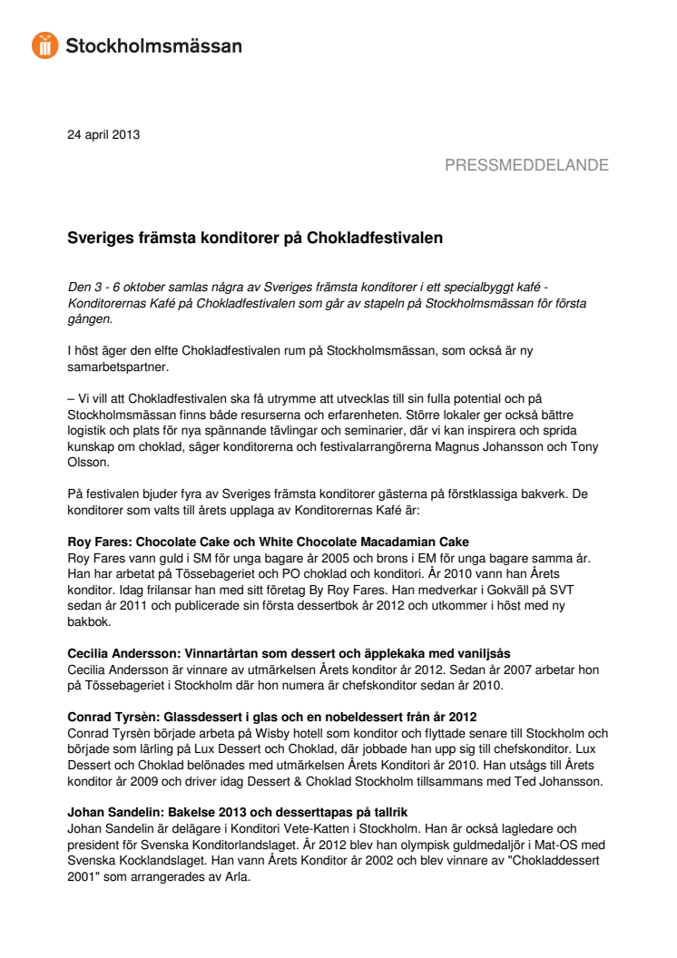 - Vi vill att Chokladfestivalen ska få utrymme att utvecklas till sin fulla potential och på Stockholmsmässan finns både resurserna och erfarenheten. Större lokaler ger också bättre logistik och plats för nya spännande tävlingar och seminarier, där vi kan inspirera och sprida kunskap om choklad, säger konditorerna och festivalarrangörerna Magnus Johansson och Tony Olsson.