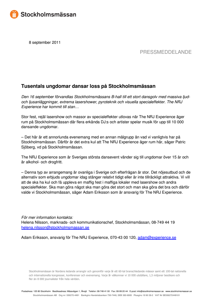 Adam Eriksson, ansvarig för The NRJ Experience, 070-43 00 120, adam@experience.se