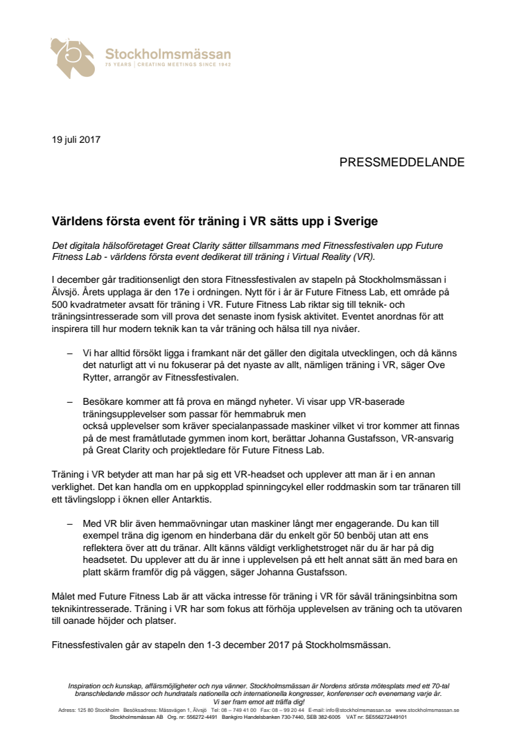I december går traditionsenligt den stora Fitnessfestivalen av stapeln på Stockholmsmässan i Älvsjö. Årets upplaga är den 17e i ordningen. Nytt för i år är Future Fitness Lab, ett område på 500 kvadratmeter avsatt för träning i VR. Future Fitness Lab riktar sig till teknik- och träningsintresserade som vill prova det senaste inom fysisk aktivitet. Eventet anordnas för att inspirera till hur modern teknik kan ta vår träning och hälsa till nya nivåer.