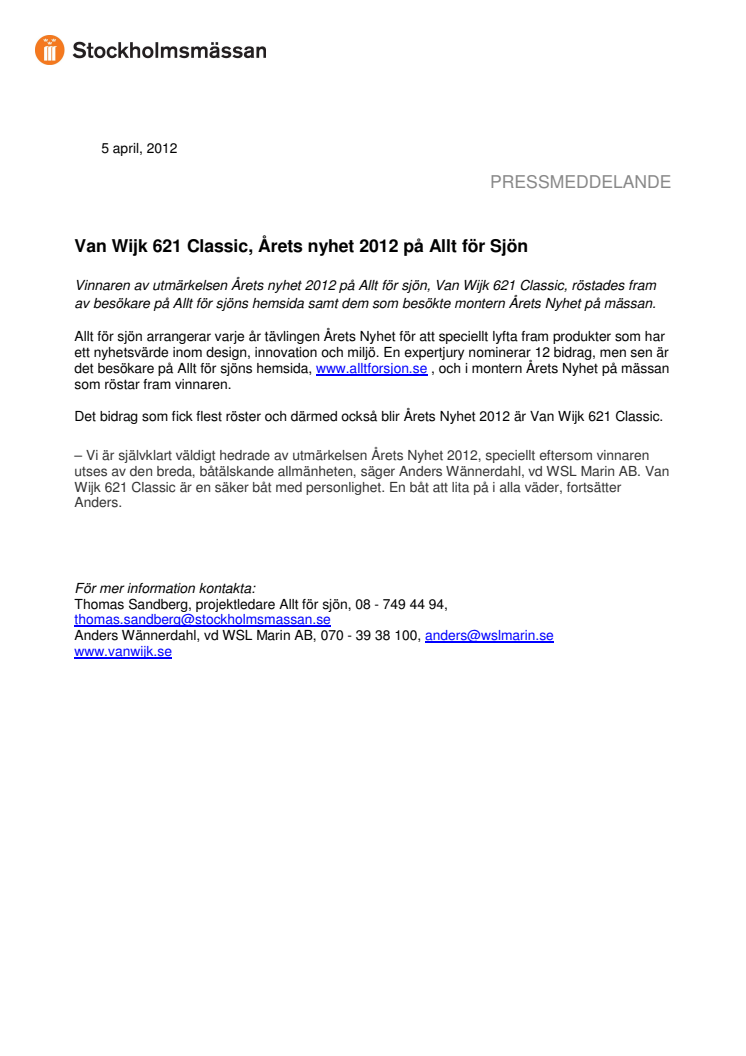 Vinnaren av utmärkelsen Årets nyhet 2012 på Allt för sjön, Van Wijk 621 Classic, röstades fram av besökare på Allt för sjöns hemsida samt dem som besökte montern Årets Nyhet på mässan.