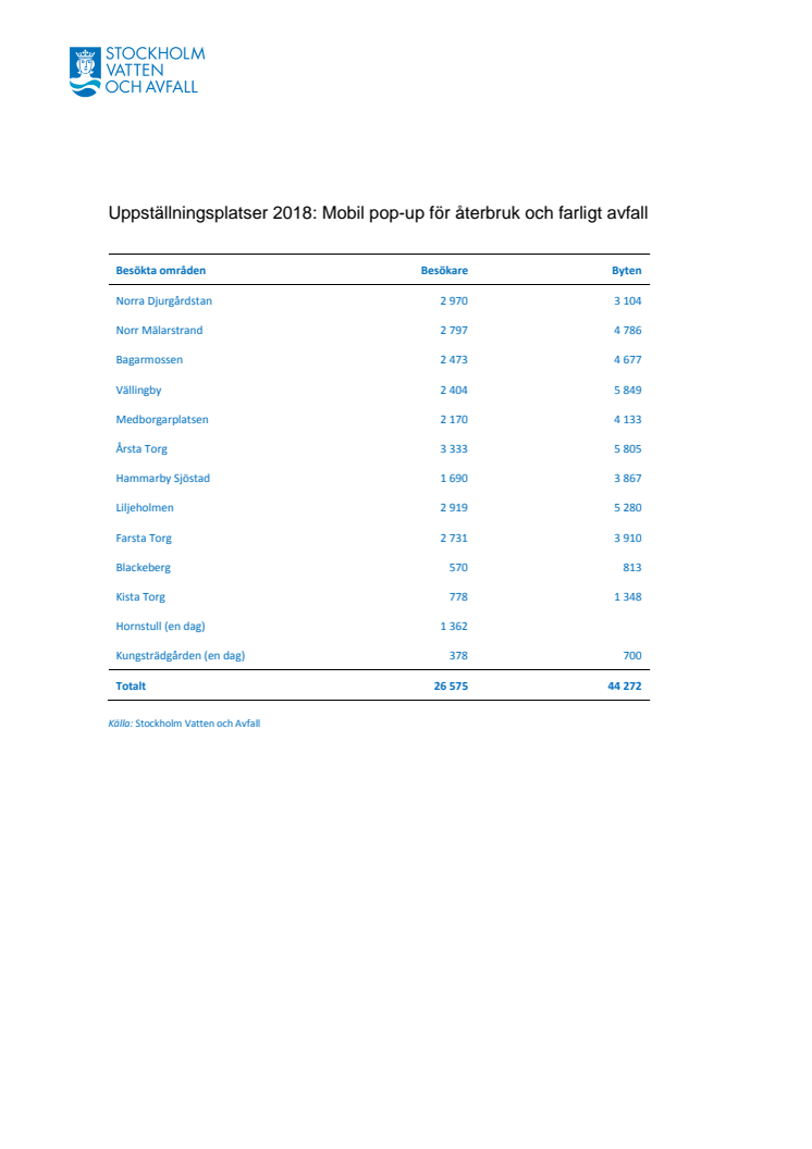 Det ska vara enkelt att göra sig av med de ägodelar man inte längre behöver. Dessutom blir det roligare om man samtidigt kan ta med sig något nytt hem. Under 2018 besökte 27 000 stockholmare stadens mobila pop-up för återbruk och farligt avfall. 44 272 föremål så som kläder, köksattiraljer, tekniska produkter och prydnadsföremål kunde då lämnas in eller hämtas upp av nya ägare gratis.