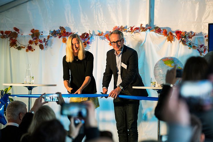 Miljöborgarråd Katarina Luhr och Stockholm Vatten och Avfalls VD Krister Schultz klipper band.
