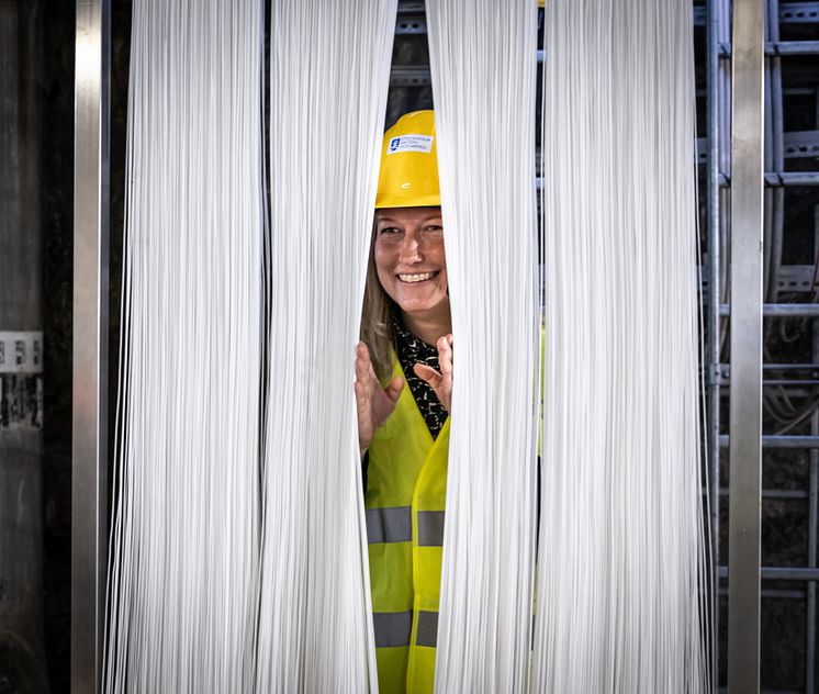 Katarina Luhr tittar genom membrantrådar vars håligheter för vattenrening är tusen gånger mindre än ett hårstrå.JPG