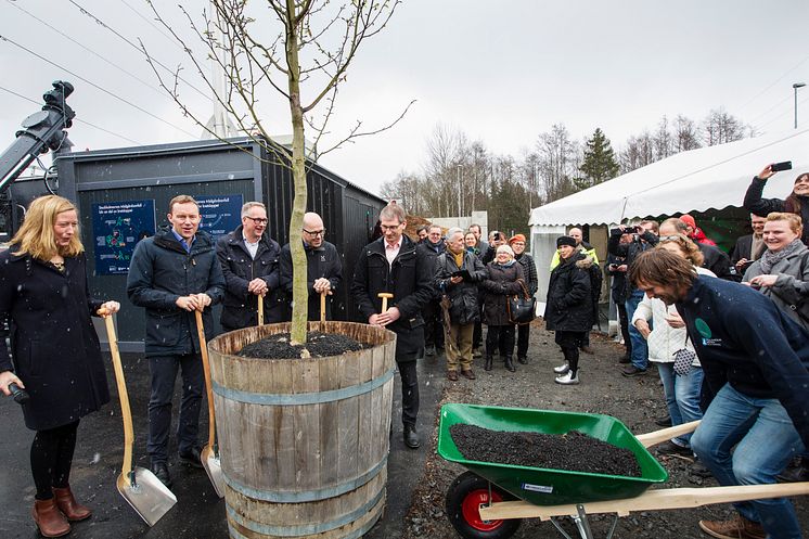 Biokol som framställts i anläggningen körs fram av projektledaren Mattias Gustafsson, för den officiella invigningen - trädplantering med biokol.