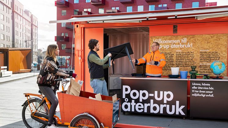 Pop-up återbruk turnerar under april - oktober runt på olika platser i Stockholm för att göra det enklare för Stockholms invånare att bli av med ägodelar som man inte längre behöver men som kan ha stort värde för någon annan.