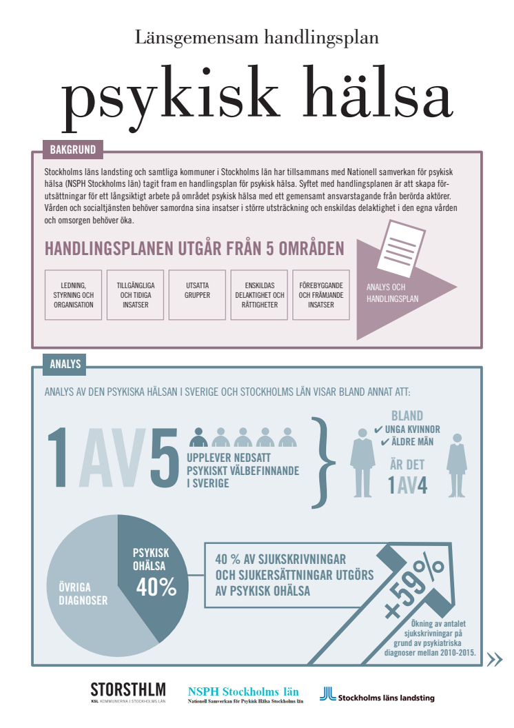 Psykisk ohälsa är den enskilt dominerande faktorn bakom sjukskrivning och sjukersättning i Sverige – psykiska sjukdomar motsvarar 40 procent av alla sjukfall. Nu har samtliga kommuner i Stockholm, Stockholms läns landsting och Nationell samverkan för psykisk hälsa (NSPH Stockholms län) tagit fram en handlingsplan för psykisk hälsa i länet.