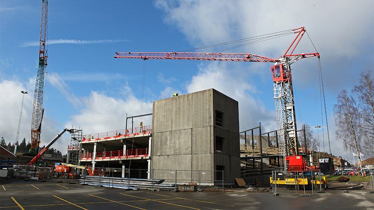 Montaget har precis avslutats, men de två kranar som använts står kvar. Just i dag lyfter de bland annat stålbalkar och annat material på plats. Nu väntar installation av räcken, brandlarm, belysning, toaletter, hissar och rullband.