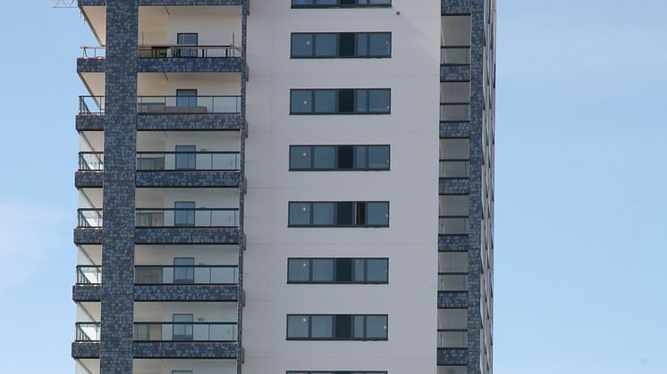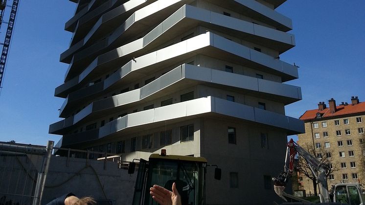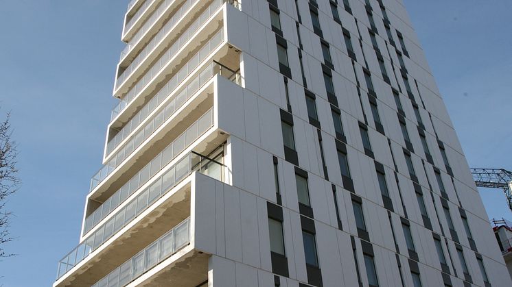 På väg in till Stockholm City svängde vi förbi bostadshusen Tuletorget som har omålad betong som fasad, dock en fasad som mest karaktäriseras av sina balkonger klädda, med silverfärgad plåt.