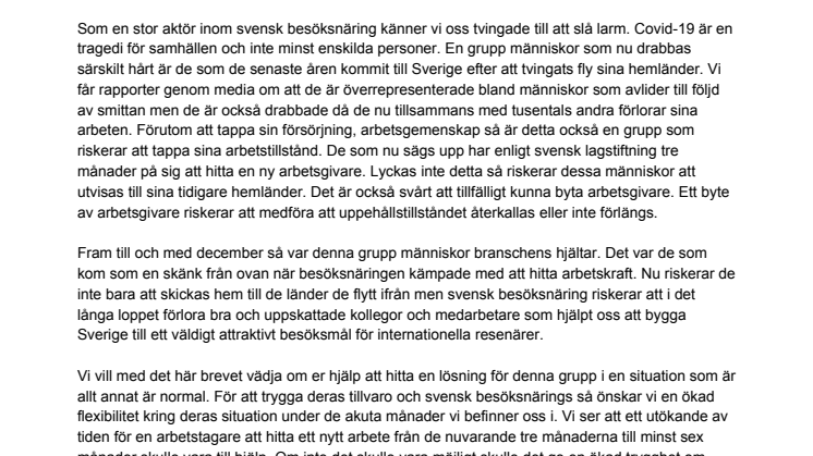 - Vi vill med brevet till Migrationsverkets generaldirektör Mikael Ribbenvik vädja om hjälp att hitta en lösning för denna grupp i en situation som är allt annat är normal. För att trygga deras tillvaro och svensk besöksnärings så önskar vi en ökad flexibilitet kring deras situation under de akuta månader vi befinner oss i, säger Tina Tropp Jerresand.