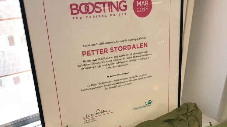 Under en ceremoni på Stockholms Handelskammare presenterades idag Petter Stordalen som vinnare av organisationens Boosting the Capital-pris. Prisets syfte är att uppmärksamma initiativ som bidragit till att göra huvudstadsregionen mer innovativ, inkluderande och utåtriktad. Stordalen fick priset med anledning av hans initiativ med juridisk rådgivning för utvisningshotade medarbetare.