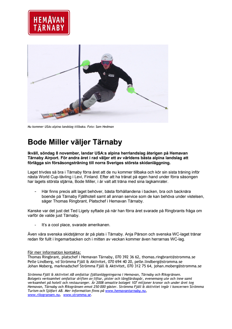 Ikväll, söndag 8 november, landar USA:s alpina herrlandslag återigen på Hemavan Tärnaby Airport. För andra året i rad väljer ett av världens bästa alpina landslag att förlägga sin försäsongsträning till norra Sveriges största skidanläggning.