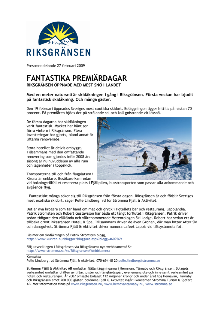 Med en meter natursnö är skidåkningen i gång i Riksgränsen. Första veckan har bjudit på fantastisk skidåkning. Och många gäster. Den 19 februari öppnades Sveriges mest exotiska skidort. Beläggningen ligger hittills på nästan 70 procent. På premiären bjöds det på strålande sol och kall gnistrande vit lössnö.