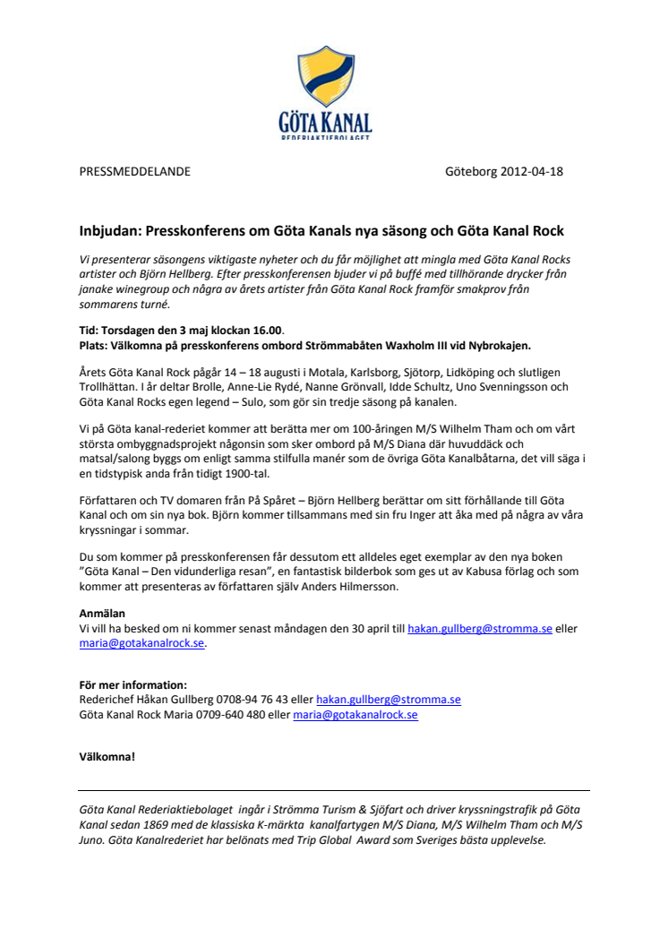 Inbjudan: Presskonferens om Göta Kanals nya säsong och Göta Kanal Rock