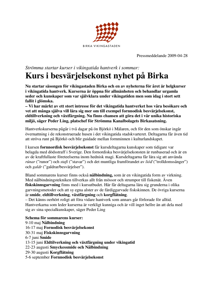Nu startar säsongen för vikingastaden Birka och en av nyheterna för året är helgkurser i vikingatida hantverk. Kurserna är öppna för allmänheten och behandlar urgamla seder och kunskaper som var självklara under vikingatiden men som idag i stort sett fallit i glömska.
