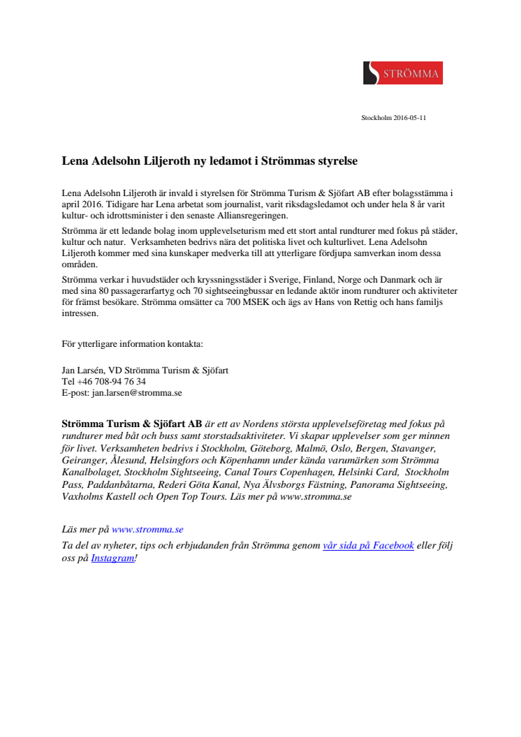 Lena Adelsohn Liljeroth är invald i styrelsen för Strömma Turism & Sjöfart AB efter bolagsstämma i april 2016. Tidigare har Lena arbetat som journalist, varit riksdagsledamot och under hela 8 år varit kultur- och idrottsminister i den senaste Alliansregeringen.