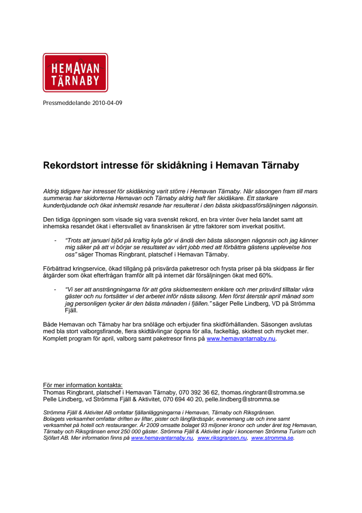 Aldrig tidigare har intresset för skidåkning varit större i Hemavan Tärnaby. När säsongen fram till mars summeras har skidorterna Hemavan och Tärnaby aldrig haft fler skidåkare. Ett starkare kunderbjudande och ökat inhemskt resande har resulterat i den bästa skidpassförsäljningen någonsin.