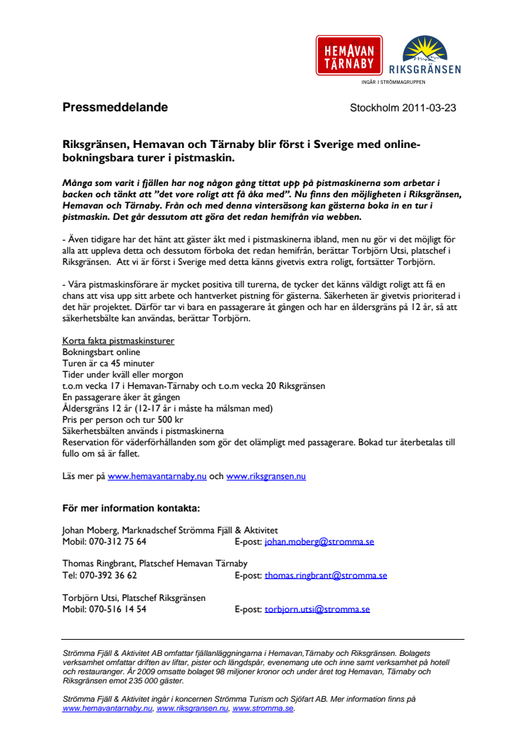 Riksgränsen, Hemavan och Tärnaby blir först i Sverige med onlinebokningsbara turer i pistmaskin.