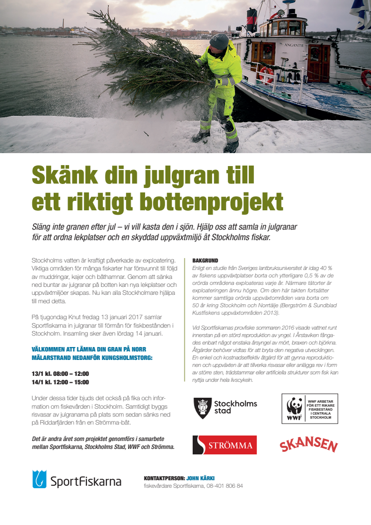 Släng inte granen efter jul – vi vill kasta den i sjön. Hjälp oss att samla in julgranar för att ordna lekplatser och en skyddad uppväxtmiljö åt Stockholms fiskar.