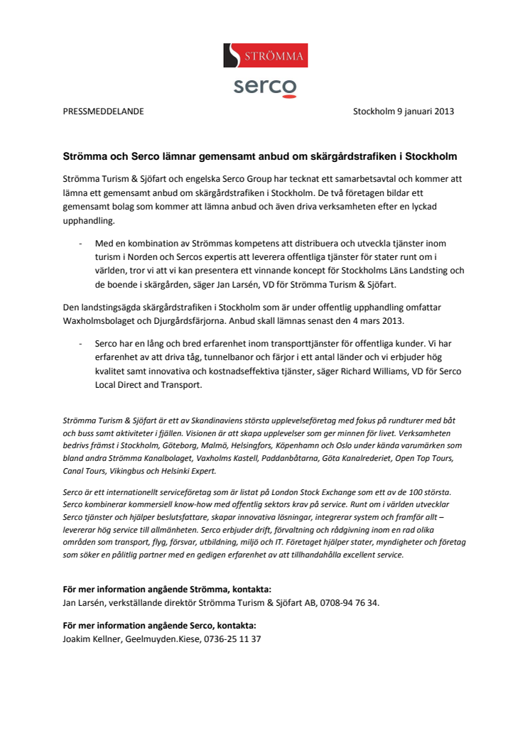 Strömma Turism & Sjöfart och engelska Serco Group har tecknat ett samarbetsavtal och kommer att lämna ett gemensamt anbud om skärgårdstrafiken i Stockholm. De två företagen bildar ett gemensamt bolag som kommer att lämna anbud och även driva verksamheten efter en lyckad upphandling.