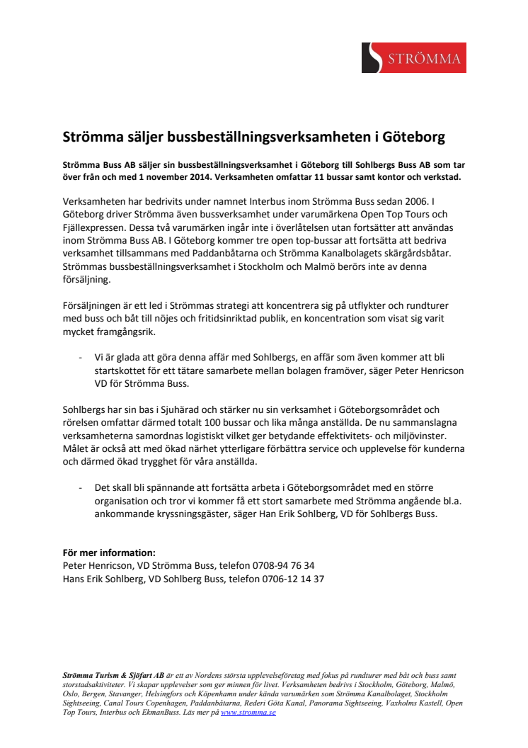 Strömma Buss AB säljer sin bussbeställningsverksamhet i Göteborg till Sohlbergs Buss AB som tar över från och med 1 november 2014. Verksamheten omfattar 11 bussar samt kontor och verkstad.