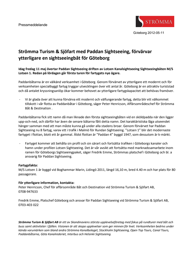 Idag fredag 11 maj övertar Paddan Sightseeing driften av Lotsen Kanalsightseeing Sightseeingbåten M/S Lotsen 1. Redan på lördagen går första turen för fartygets nye ägare.