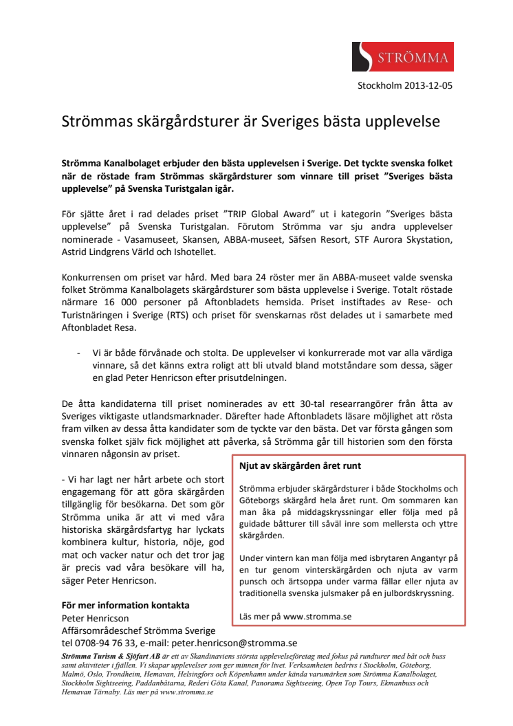 Strömma Kanalbolaget erbjuder den bästa upplevelsen i Sverige. Det tyckte svenska folket när de röstade fram Strömmas skärgårdsturer som vinnare till priset ”Sveriges bästa upplevelse” på Svenska Turistgalan igår.