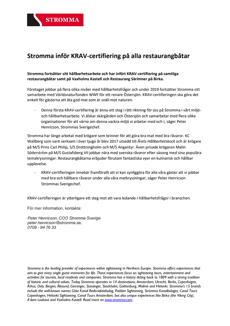 Stromma fortsätter sitt hållbarhetsarbete och har infört KRAV-certifiering på samtliga restaurangbåtar samt på Vaxholms Kastell och Restaurang Särimner på Birka.