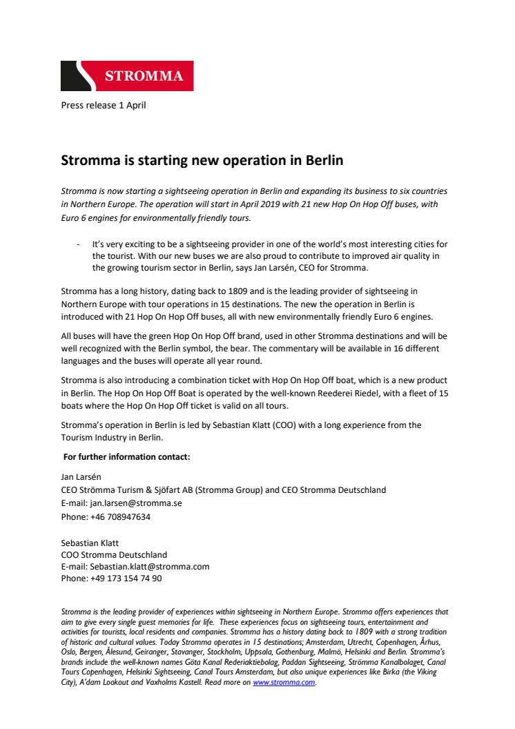Stromma is now starting a sightseeing operation in Berlin and expanding its business to six countries in Northern Europe. The operation will start in April 2019 with 21 new Hop On Hop Off buses, with Euro 6 engines for environmentally friendly tours.