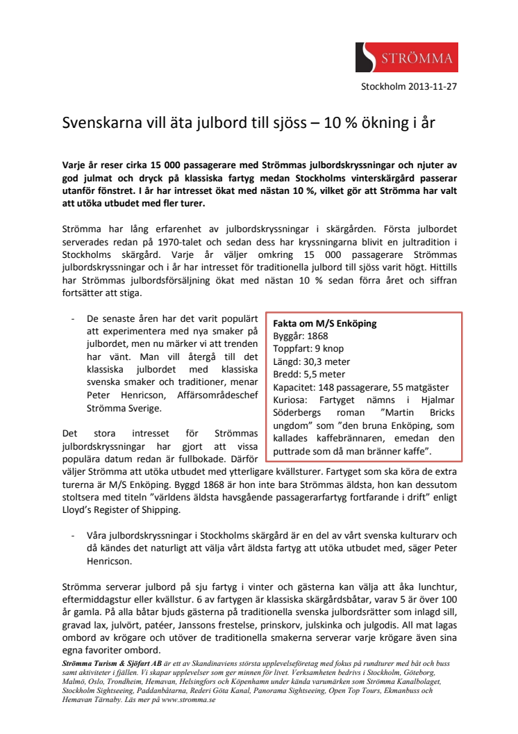 Varje år reser cirka 15 000 passagerare med Strömmas julbordskryssningar och njuter av god julmat och dryck på klassiska fartyg medan Stockholms vinterskärgård passerar utanför fönstret. I år har intresset ökat med nästan 10 %, vilket gör att Strömma har valt att utöka utbudet med fler turer.