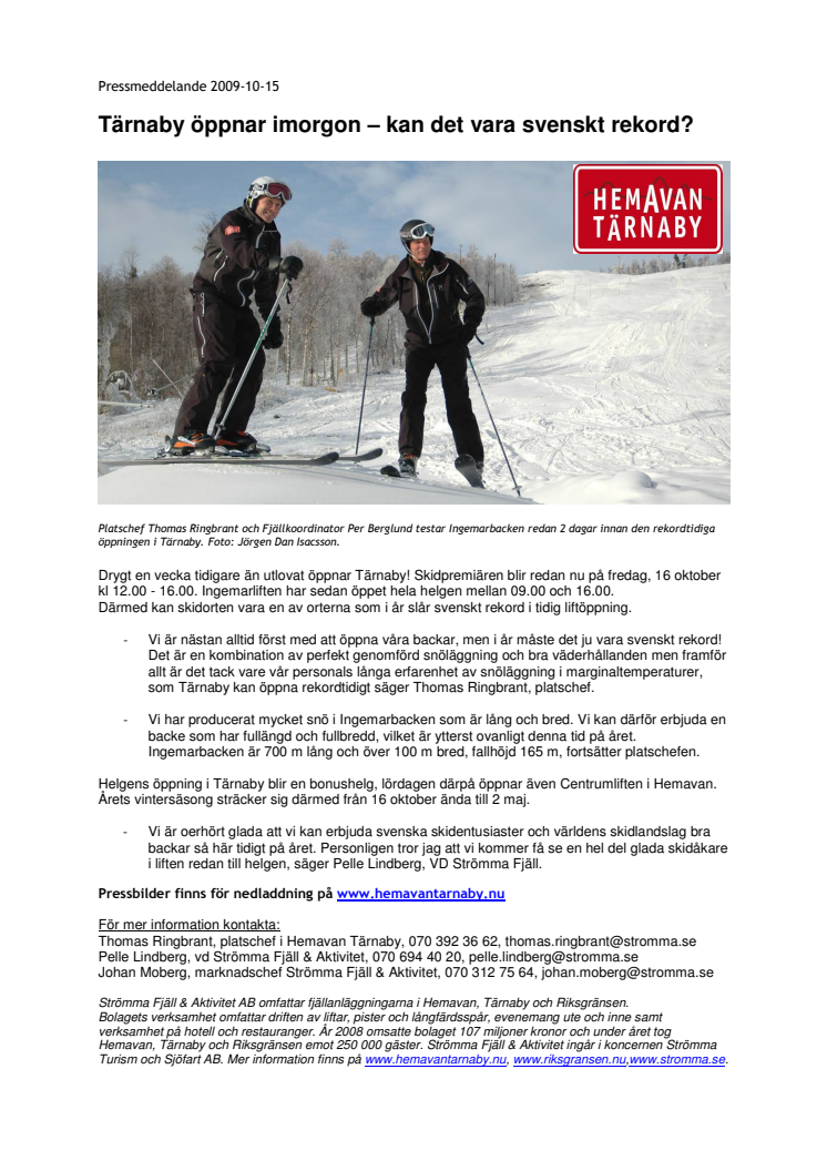 Drygt en vecka tidigare än utlovat öppnar Tärnaby! Skidpremiären blir redan nu på fredag, 16 oktober kl 12.00 - 16.00. Ingemarliften har sedan öppet hela helgen mellan 09.00 och 16.00.