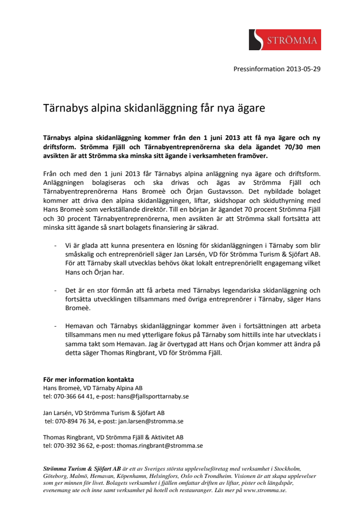 Tärnabys alpina skidanläggning kommer från den 1 juni 2013 att få nya ägare och ny driftsform. Strömma Fjäll och Tärnabyentreprenörerna ska dela ägandet 70/30 men avsikten är att Strömma ska minska sitt ägande i verksamheten framöver.