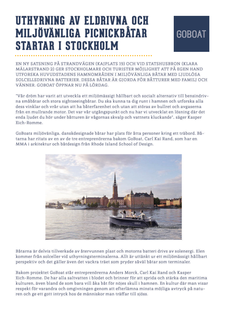 En ny satsning på Strandvägen och vid Statshusbron ger stockholmare och turister möjlighet att på egen hand utforska huvudstadens hamnområden i miljövänliga båtar med ljudlösa solcellsdrivna batterier. Båtarna är gjorda för båtturer med familj och vänner. GoBoat öppnar nu på lördag.
