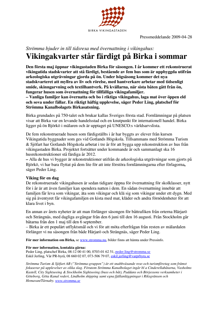 Den första maj öppnar vikingastaden Birka för säsongen. I år kommer ett rekonstruerat vikingatida stadskvarter att stå färdigt, bestående av fem hus som är uppbyggda utifrån arkeologiska utgrävningar gjorda på ön. Under högsäsong kommer det nya stadskvarteret att myllra av liv och rörelse, med hantverkare arbetar med tidsenligt smide, skinngarvning och textilhantverk.