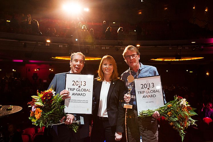 Vinnarna i TRIP Global Award 2013 blev Strömma Kanalbolaget och Ishotellet. På bilden Peter Henricson, Strömma Kanalbolagets skärgårdsupplevelser (svenskarnas röst), Annie Lööf, näringsminister, Dan Björk, Ishotellet (utländska rösterna). Bild från Rese- och Turistnäringen i Sverige (RTS)