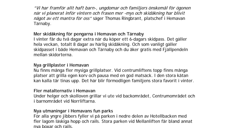 "Vi har framför allt haft barn-, ungdomar och familjers önskemål för ögonen när vi planerat inför vintern och frasen mer -mys och skidåkning har blivit något av ett mantra för oss" säger Thomas Ringbrant, platschef i Hemavan Tärnaby.