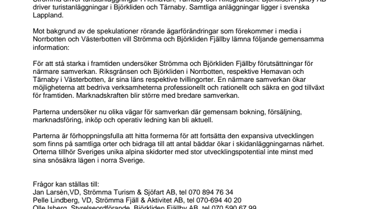Mot bakgrund av de spekulationer rörande ägarförändringar som förekommer i media i Norrbotten och Västerbotten vill Strömma och Björkliden Fjällby lämna följande gemensamma information: