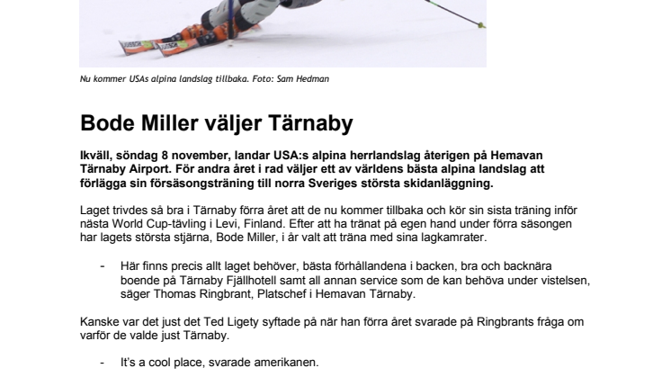 Laget trivdes så bra i Tärnaby förra året att de nu kommer tillbaka och kör sin sista träning inför nästa World Cup-tävling i Levi, Finland. Efter att ha tränat på egen hand under förra säsongen har lagets största stjärna, Bode Miller, i år valt att träna med sina lagkamrater.