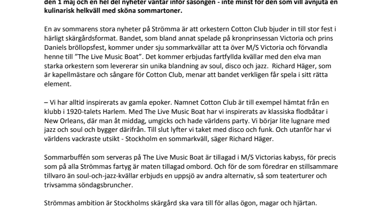 En av sommarens stora nyheter på Strömma är att orkestern Cotton Club bjuder in till stor fest i härligt skärgårdsformat. Bandet, som bland annat spelade på kronprinsessan Victoria och prins Daniels bröllopsfest, kommer under sju sommarkvällar att ta över M/S Victoria och förvandla henne till ”The Live Music Boat”. Det kommer erbjudas fartfyllda kvällar med den elva man starka orkestern som levererar sin unika blandning av soul, disco och jazz. Richard Häger, som är kapellmästare och sångare för Cotton Club, menar att bandet verkligen får spela i sitt rätta element.