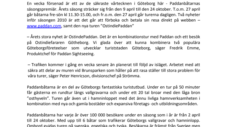 En vecka försenad är ett av de säkraste vårtecknen i Göteborg här - Paddanbåtarnas säsongspremiär. Årets säsong sträcker sig från den 9 april till den 24 oktober. T.o.m. 27 april går båtarna fre-sön kl 11.30-15.00, och fr.o.m. den 27 april går turerna dagligen. Två nyheter inför säsongen 2010 är att det går att förboka och betala sin resa direkt på webben – www.paddan.com, samt den nya turen ”OstindiePaddan”.