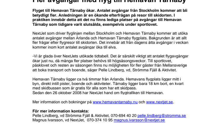 NextJet som driver flyglinjen mellan Stockholm och Hemavan Tärnaby kommer att utöka antalet avgångar mellan Arlanda och Hemavan Tärnaby flygplats. Bakgrunden är att allt fler frågar efter flygresor till skidorten. Det innebär att från dagens åtta avgångar i veckan kommer inom kort antalet avgångar öka till elva.